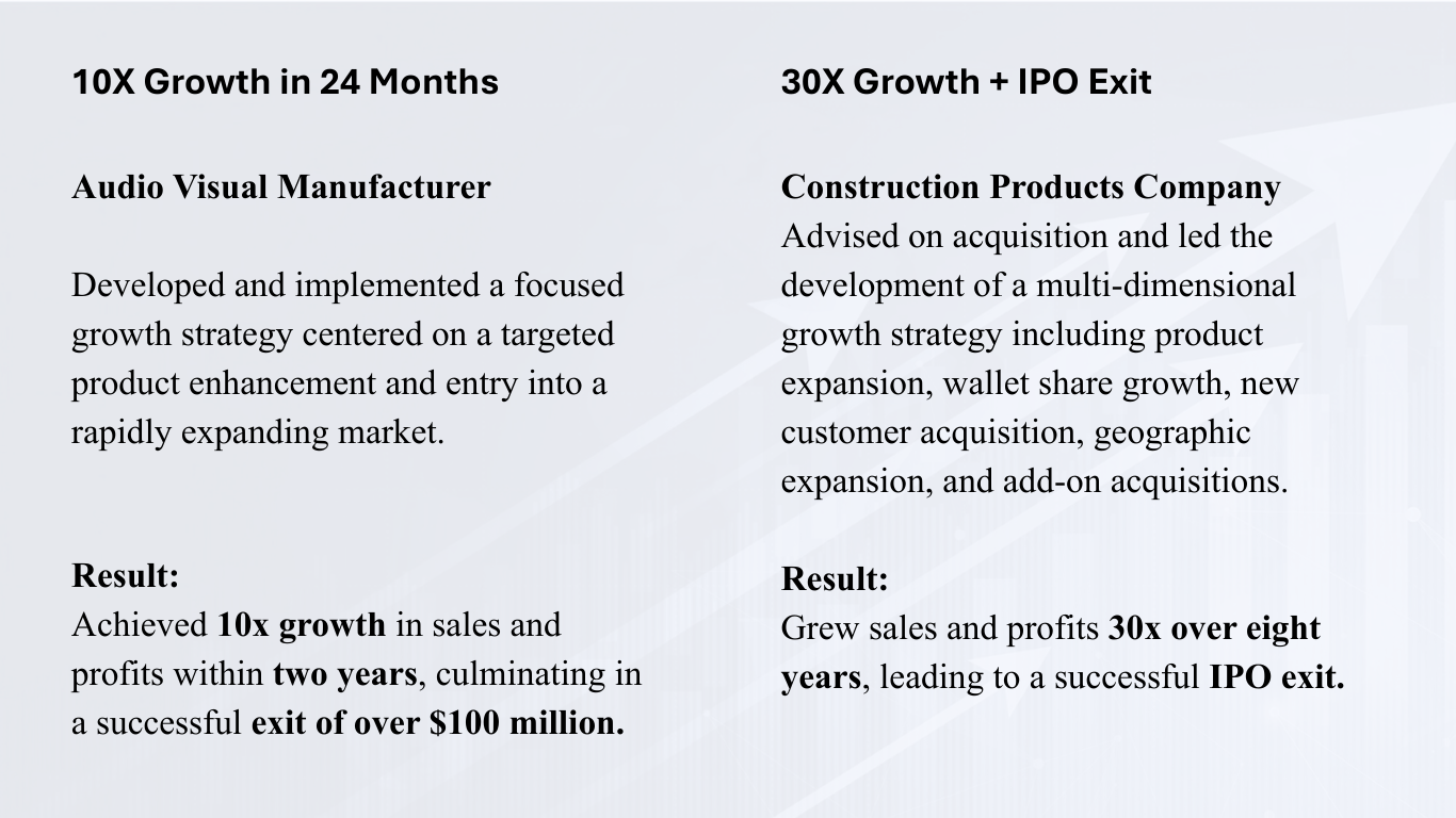We have helped hundreds of businesses significantly grow revenues, profitability and value — and can do the same for you.