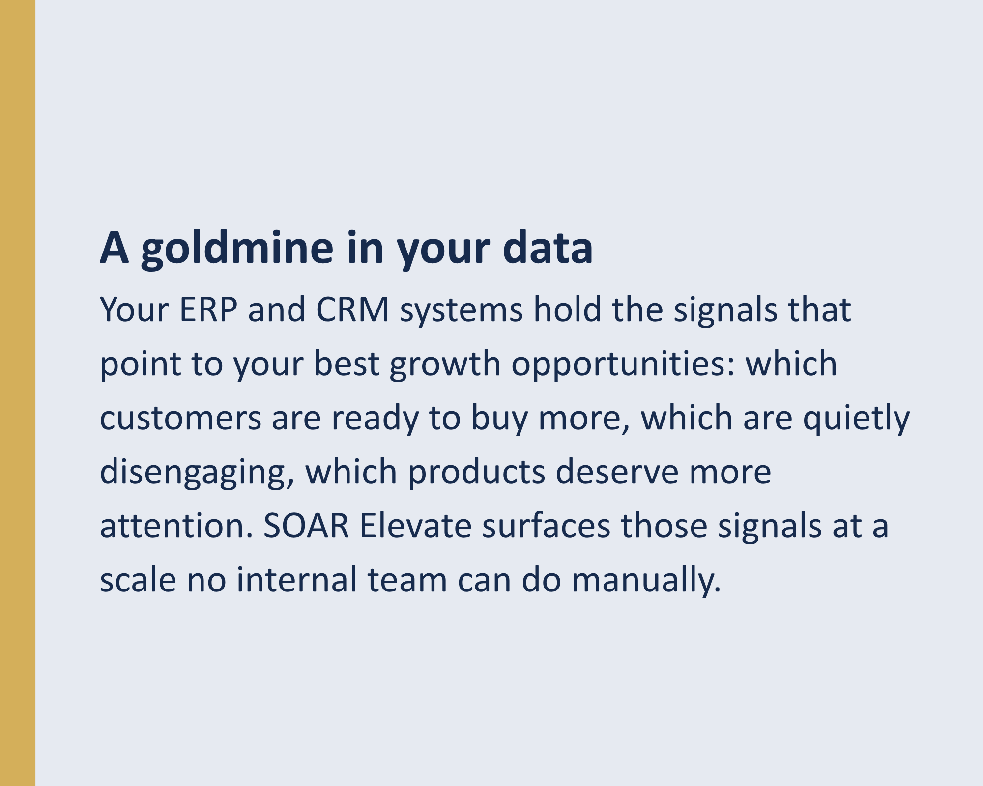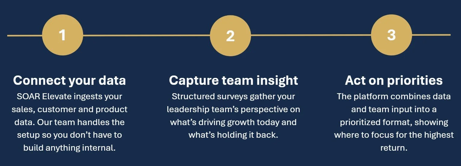 Every middle-market company is sitting on a valuable asset; years of sales history, deep customer relationships, and a leadership team that knows the business from the inside. SOAR Elevate turns that asset into your next growth plan.