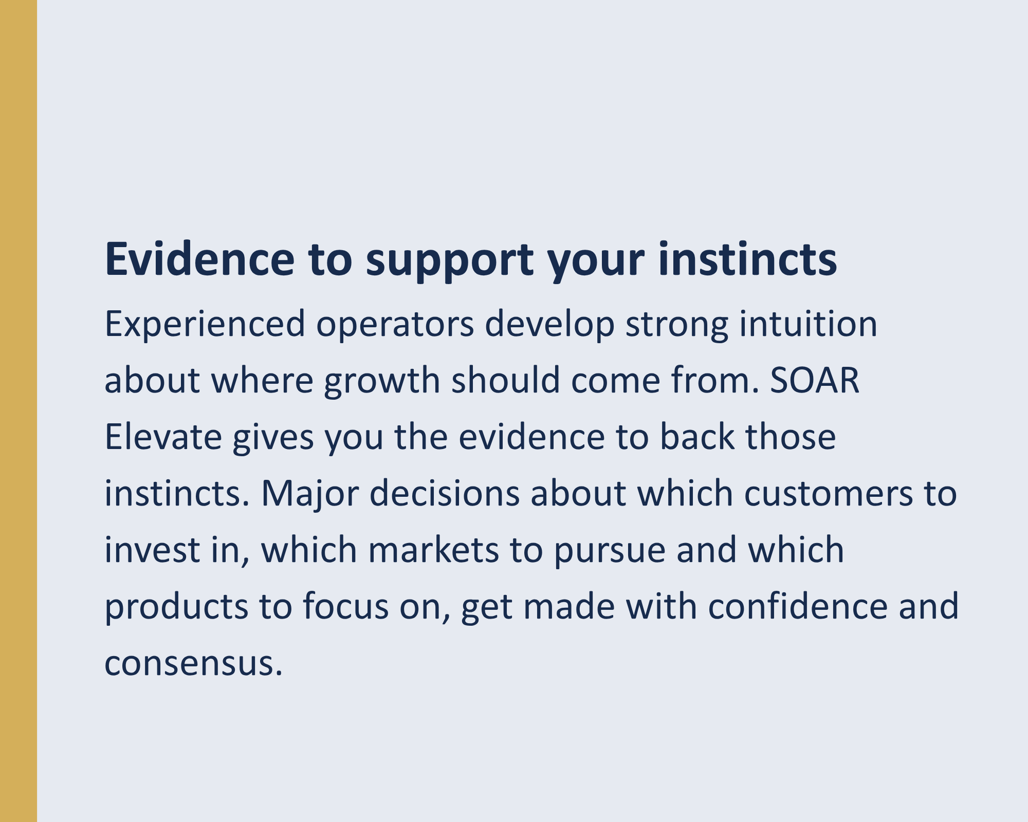SOAR Elevate is the analytics platform that helps middle-market leadership teams see exactly where their growth is sitting inside their own business, and what to do about it. Built on decades of proven methodology.