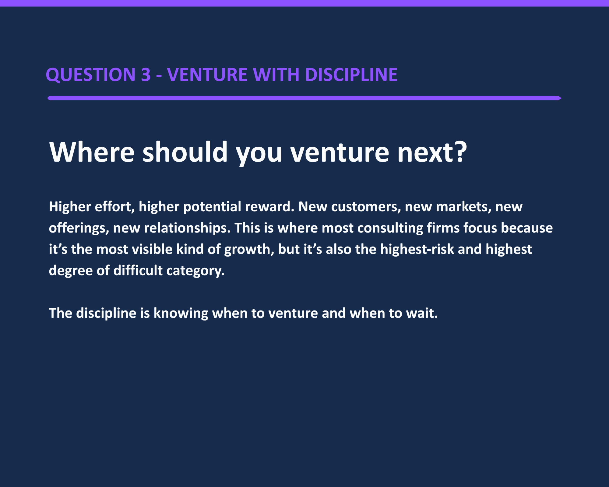 Most middle-market companies pursue the same two or three growth plays their competitors are pursuing. The result is incremental gains in a crowded field. Parkland’s growth methodology helps leadership teams evaluate a much wider set of options, prioritize the ones with the highest return for their specific situation, and build execution plans the team can actually run. The work is organized around three strategic questions every growth plan has to answer.